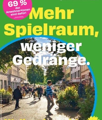 Die Ergebnisse bestätigen den positiven Eindruck, den auch wir, die Fraktion Bündnis 90 /Die Grünen, im Laufe der Testphase sammeln konnten. Die Straße wurde zum Lebensraum, ohne Gedränge auf den Gehwegen, mit Kommunikation auf der Straße und an den Sitzgelegenheiten. Die mobilen Hochbeete haben Orte aufgezeigt, an denen bei einem dauerhaften Umbau eine Begrünung mit echten Bäumen und Beeten realisiert werden kann.