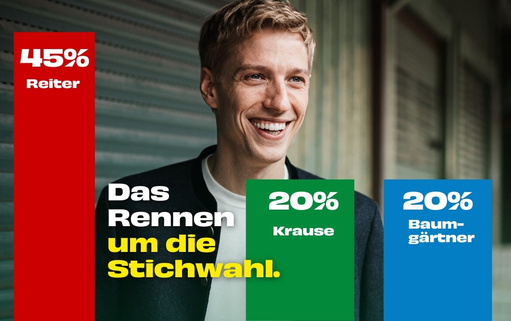 Eine aktuelle, repräsentative Forsa-Umfrage zur Oberbürgermeisterwahl in München am 8. März 2026 im Auftrag der Münchner Grünen bringt Bewegung in den Wahlkampf: Amtsinhaber Dieter Reiter (SPD) verfehlt die absolute Mehrheit und muss in die Stichwahl. Dahinter liegt das Feld eng beisammen: Dominik Krause (BÜNDNIS 90/DIE GRÜNEN) und CSU-Kandidat Clemens Baumgärtner erreichen jeweils 20 Prozent. Damit ist klar: Das Rennen um den Einzug in die Stichwahl ist offen.