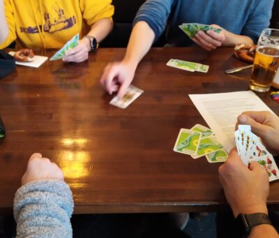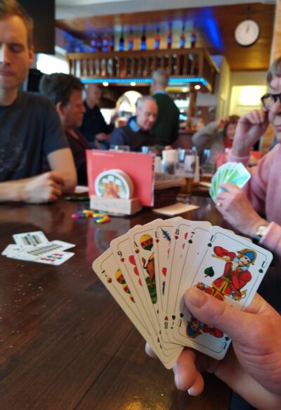 An verschiedenen Tischen wurde mit großer Begeisterung gespielt – mal begleitet von Brezn und Obatzdn, mal von ausgewählten (Bio‑)Weinen. Beide Turniere waren geprägt von viel Freude, spannenden Runden und einer wunderbaren Atmosphäre.