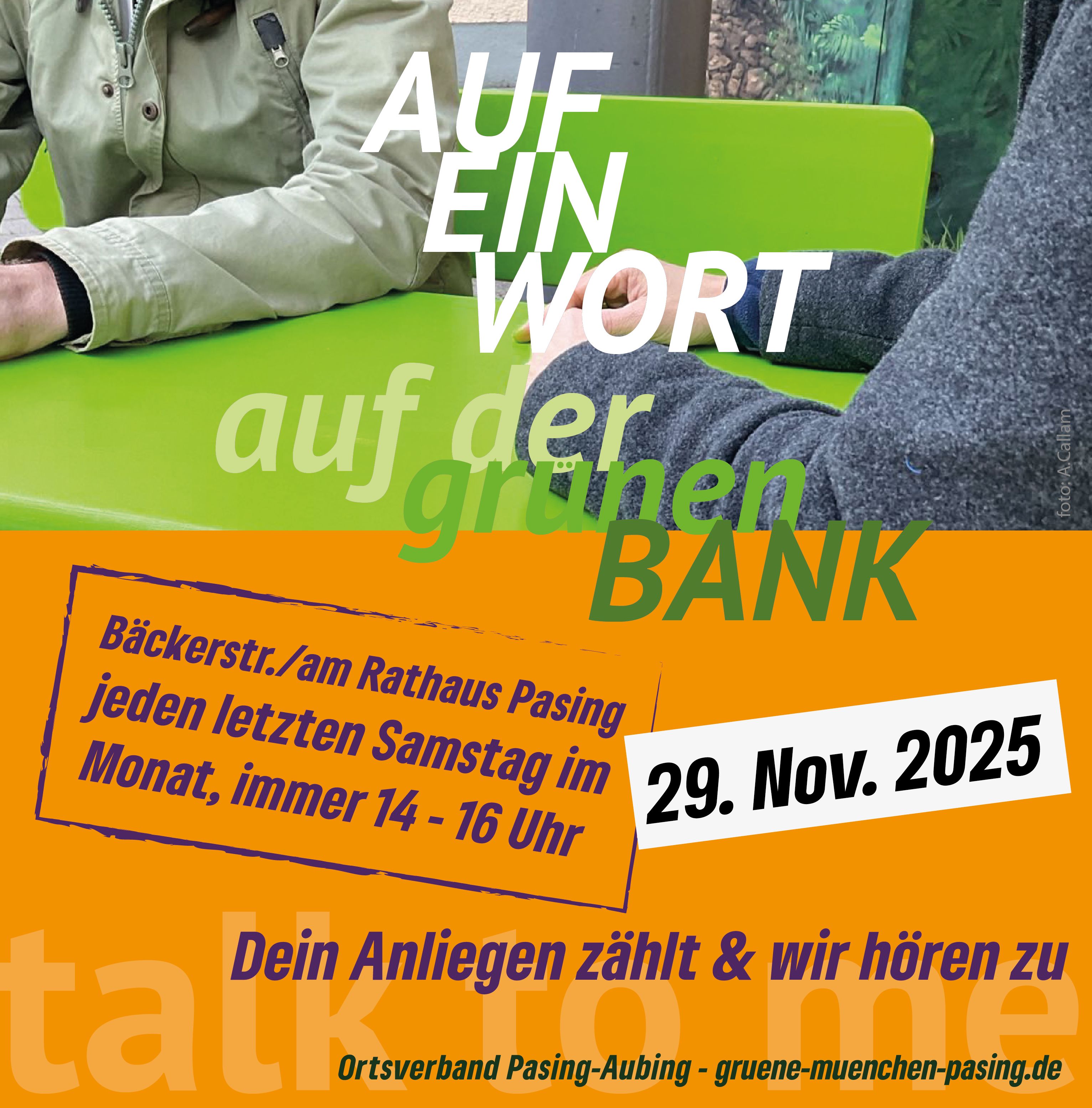 Ein offenes Ohr für die Anliegen der Bürgerinnen und Bürger – das ist das Ziel der Veranstaltungsreihe „Auf ein Wort auf der grünen Bank“, die ab sofort regelmäßig von Mitgliedern unseres Ortsverband Pasing/Obermenzing ins Leben gerufen wird. Unter dem Motto „Wir sind da und hören zu!” laden wir alle Interessierten herzlich ein, vorbeizuschauen und persönlich ins Gespräch zu kommen.