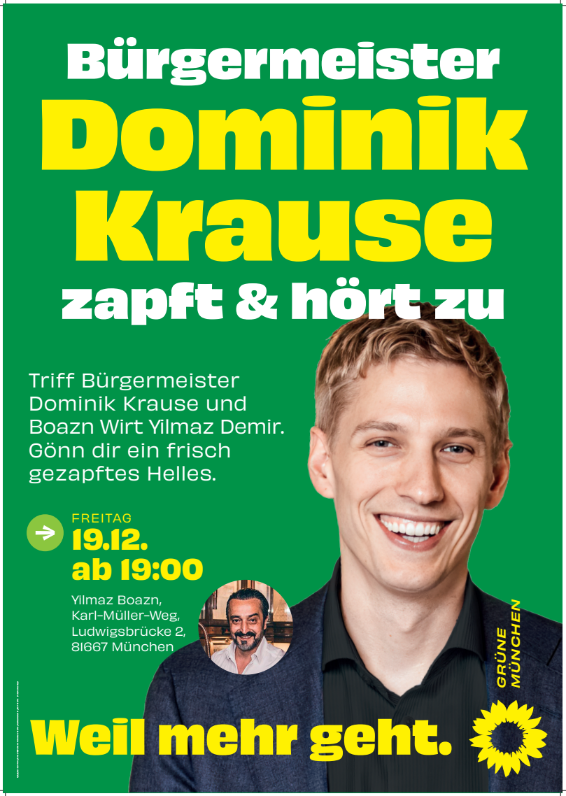 Bei „Dominik Krause zapft & hört zu“ nimmt sich unser Zweiter Bürgermeister Dominik Krause bei Boazn-Wirt Yilmaz Demir Zeit für das, was im Alltag oft zu kurz kommt: echte Gespräche. In entspannter Wirtshausatmosphäre kannst du Dominik treffen, Fragen stellen, deine Themen loswerden – oder einfach zuhören, wie er über Münchens Zukunft spricht.