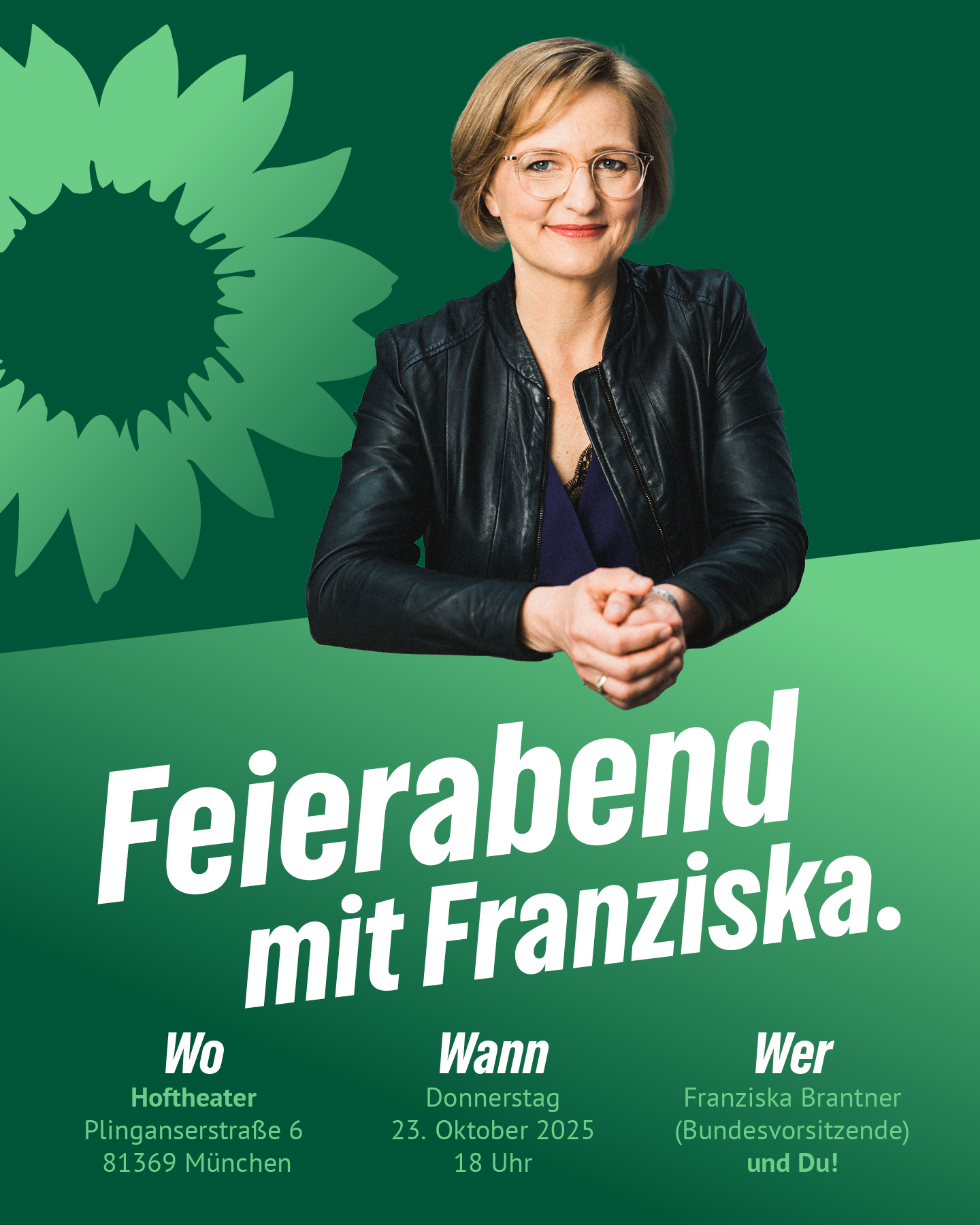 Wir freuen uns, dass unsere Bundesvorsitzende Franziska Brantner nach München kommt! Hier ist ihre Einladung an dich und uns alle:
