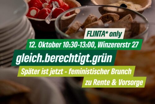 Pia Ahrens wird uns durch den feministischen Brunch „Später ist jetzt“ führen, bei dem wir die strukturellen Probleme des deutschen Rentensystems unter die Lupe nehmen – mit einem besonderen Fokus auf die Lebensrealitäten von FLINTA*-Personen. .