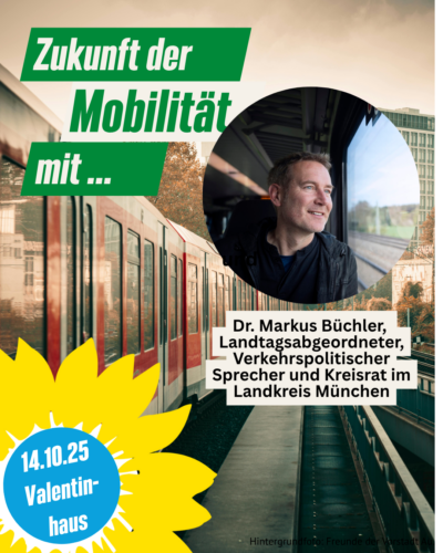 wir laden euch herzlich zu unserem nächsten Treffen des Ortsverbands am Dienstag, den 14. Oktober 2024, um 19 Uhr im Valentinhaus (Zeppelinstr 41) ein. An diesem Abend wollen wir uns dem Thema Mobilität der Zukunft in München widmen. Zu diesem Anlass begrüßen wir Dr. Markus Büchler MdL, verkehrspolitischer Sprecher der Grünen im Bayerischen Landtag und einer der profiliertesten Stimmen für nachhaltige Mobilität in Bayern. Gemeinsam mit ihm möchten wir darüber sprechen, wie die Verkehrswende konkret vor Ort gelingen kann – vom sicheren Rad- und Fußverkehr in unserem Viertel über leistungsfähige und bezahlbare Angebote des öffentlichen Nahverkehrs bis hin zu einer gerechten Flächenverteilung im öffentlichen Raum.
