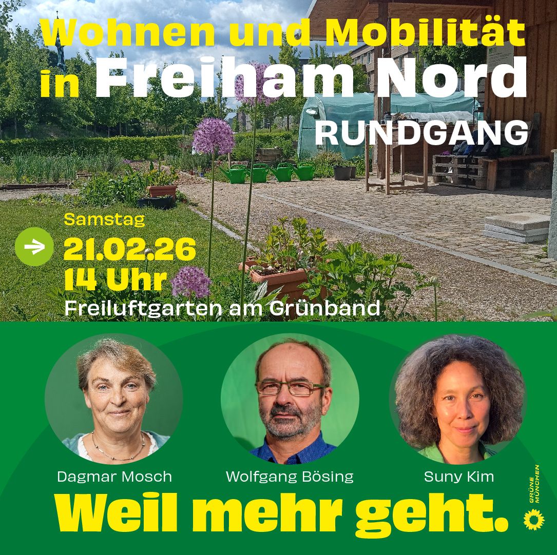 Nach dem letzten, sehr erfolgreichen Rundgang in Freiham am So 19. Okt. 2025 folgt nun die Fortsetzung in Richtung Norden . Daher kommen Sie bitte am Sa 21.02.2026 zu 14 Uhr zum neuen Treffpunkt im Grünband am Freiluftgarten in der Nähe der Skuptur „Freihamer Folly“, wenn Sie gern teilnehmen wollen.