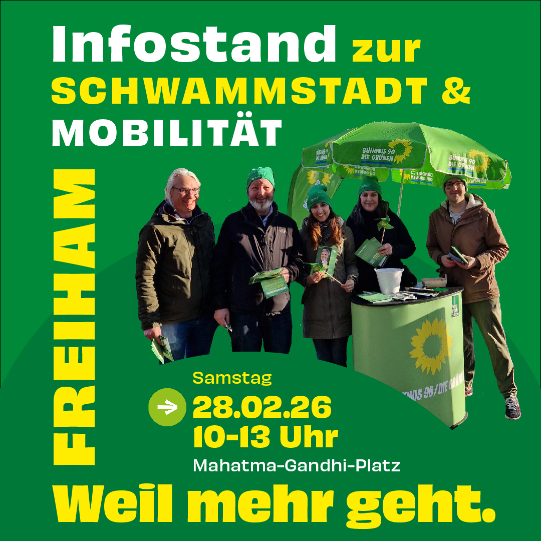 Wir sind am Samstag, 28. Februar 2026 von 10 – 13 Uhr am Mahatma-Gandhi-Platz sichtbar grün für Sie da. Mit von der Partie sind diesmal